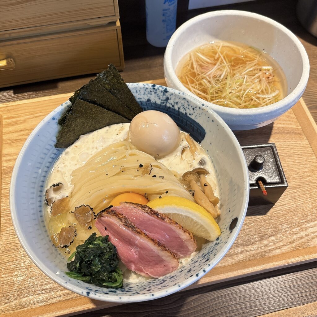 細ネギと鴨脂浮かぶキリッとした塩味が特徴的な淡麗鴨塩スープに、豆乳生クリームに浸ったモチモチ平打ちストレート麺をつけて。麺をそのままで食べて美味しいのはもちろん、トリュフ塩をかけたりTKM風にして食べたりで未体験の楽しさがあります。徐々に表情を変えるスープにも魅了されますね。つけ麺の枠を出たつけ麺とはまさにこういう一杯を言うんだろうな。鴨チャーシューが相変わらず最高でした。