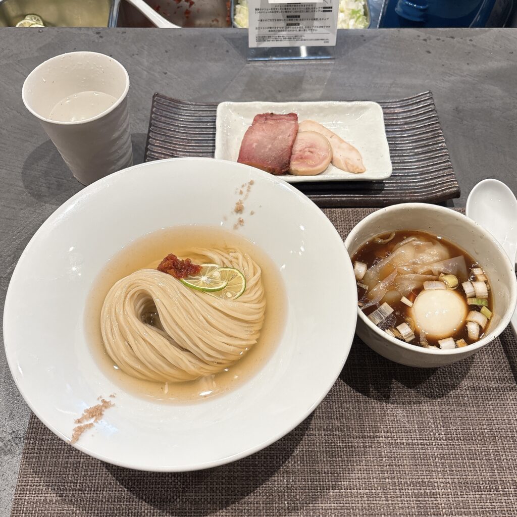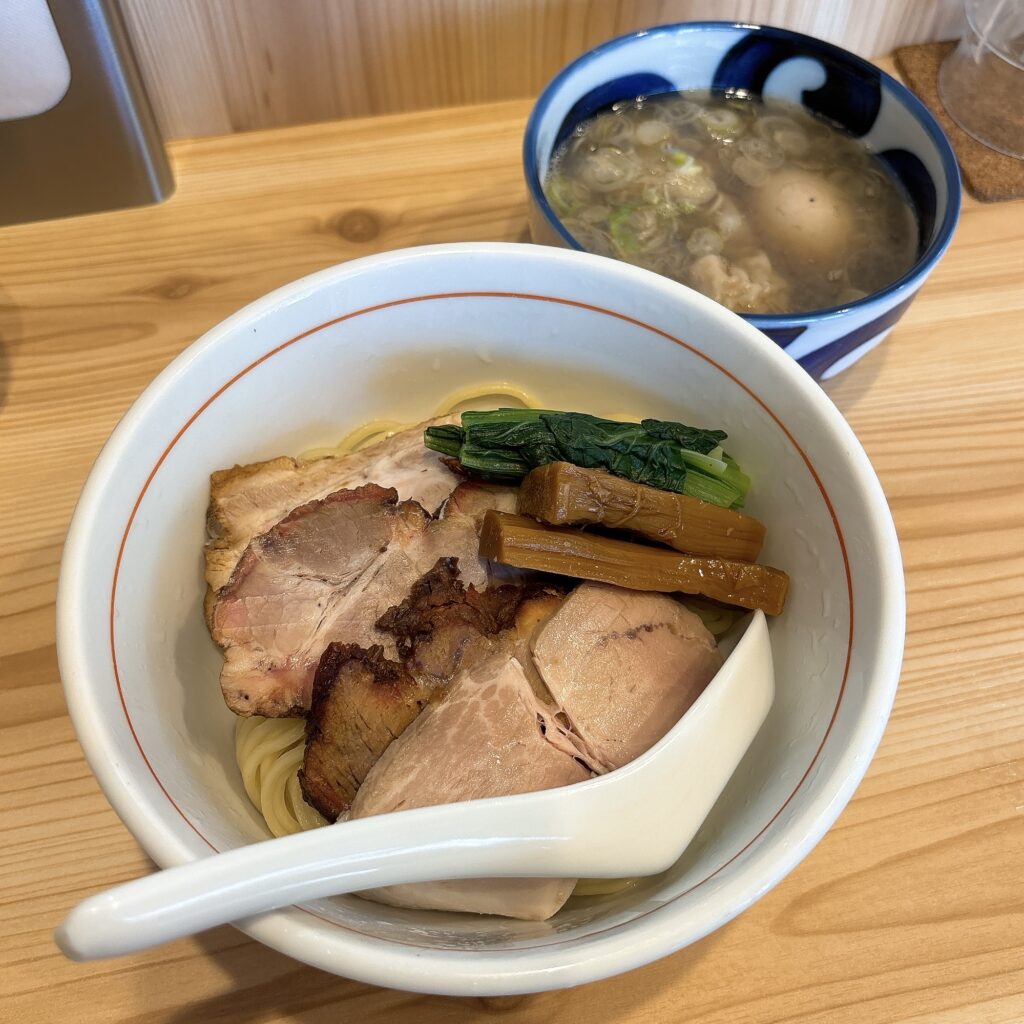 岩中豚、丸鶏、しじみ、乾物等から成る淡麗塩スープに、喉越しの良い自家製中太ストレート麺をつけて。化学調味料不使用で、とにかく出汁感が強くめちゃくちゃ美味しい。出汁の旨みに溺れるとはまさにこのことか。しじみがいいアクセントになっているなと感じました。甘辛い蕎麦つゆでサッパリといただくのもいいですね。自家製麺との相性も抜群だ。岩中豚のしっとりチャーシューやホロホロ味玉も逸品でした。
