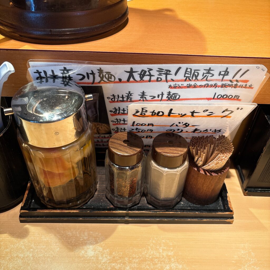 お客様自身で味の変化を楽しむために、ほとんどのお店が卓上調味料を用意しています。ただあくまで味の変化を演出するものとして、中盤〜終盤にかけて使った方がいい場面が多いと感じます。やはり最初はつけ麺本来の味で楽しみたいですよね。また、辛味やお酢などはスープに投入すると以降の味が全て変化してしまうので、麺につけたりかける食べ方を個人的には推奨します。